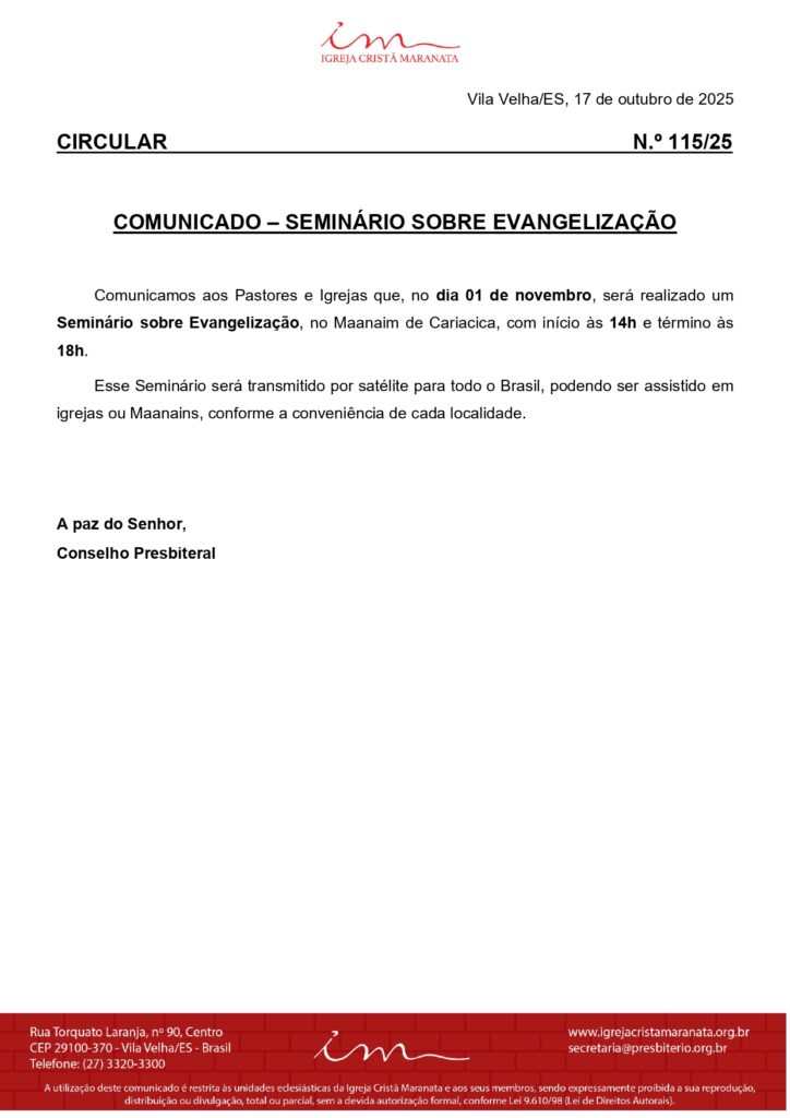 Circular N° 115/25Por maisquepalavrasicm@gmail.com / 17 de outubro de 2025 COMUNICADO – SEMINÁRIO SOBRE EVANGELIZAÇÃO